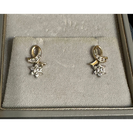 10k Yellow Gold Diamond Dainty Pierced Flower Ribbon Stud Earrings