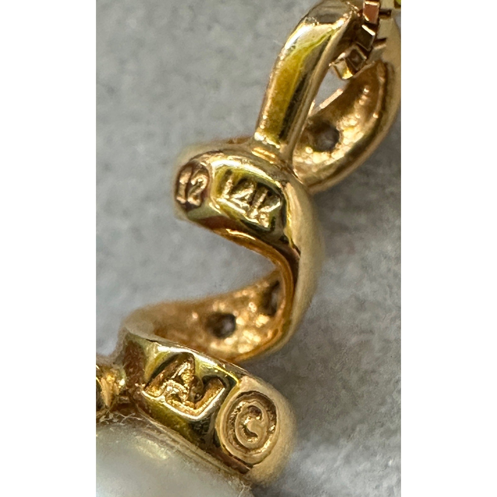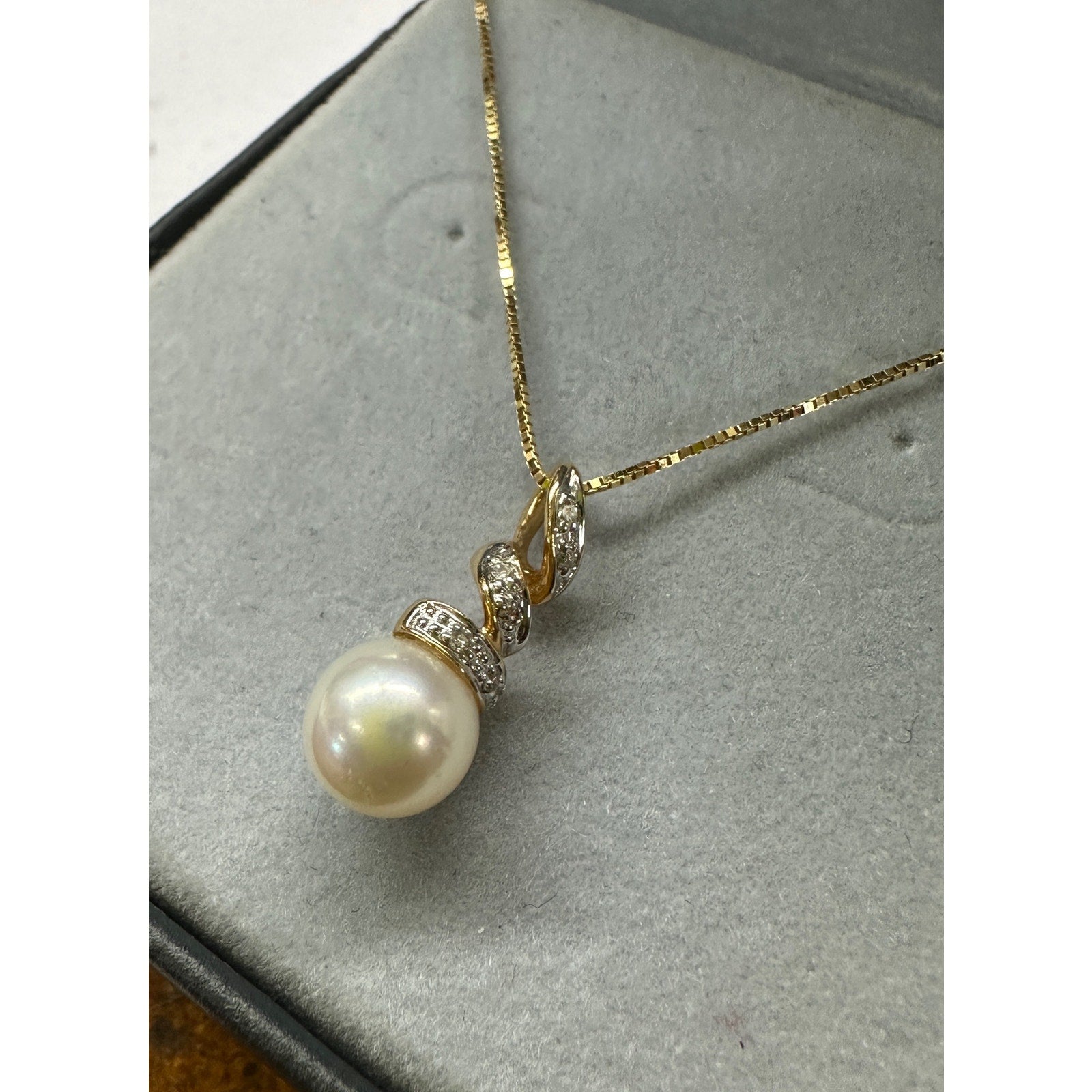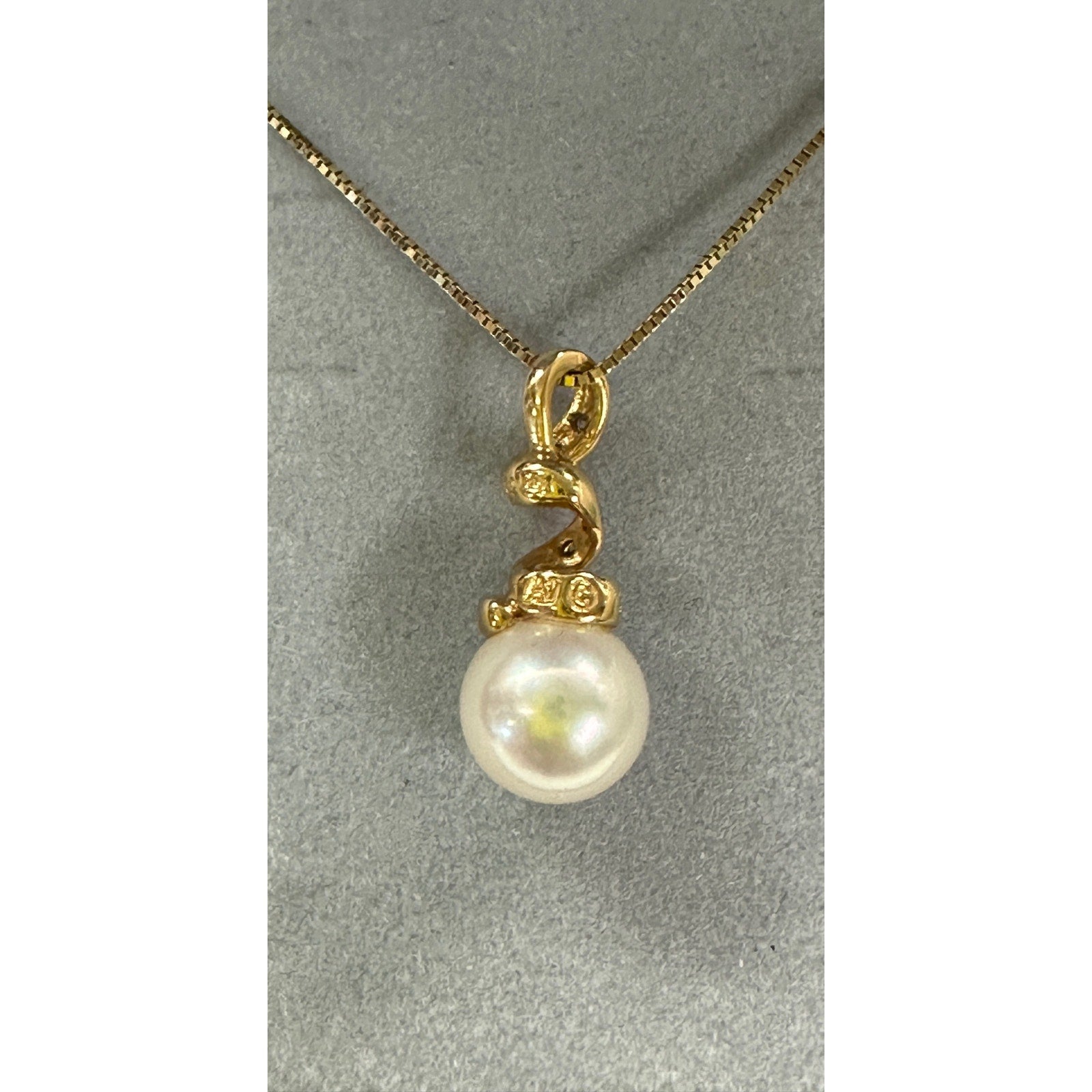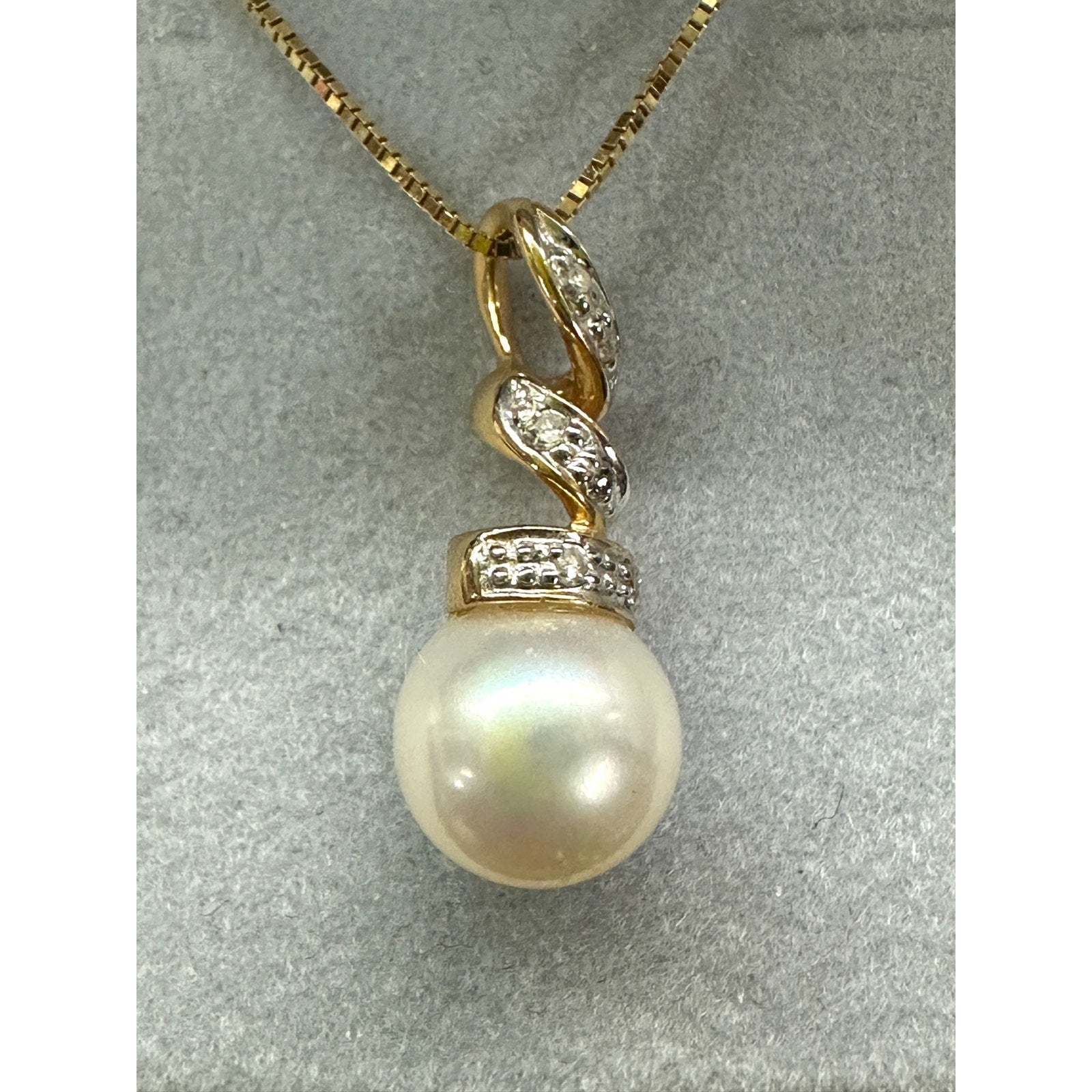 14k Yellow Gold Pearl Diamond Pendant Necklace. 16” chain. Pearl pendant is 3/4” long. 7.75mm pearl. 6 tiny diamonds. 2.3g. Signed AJ 14k
