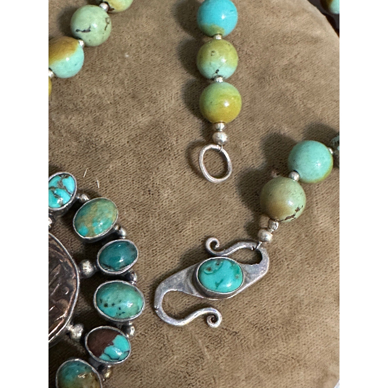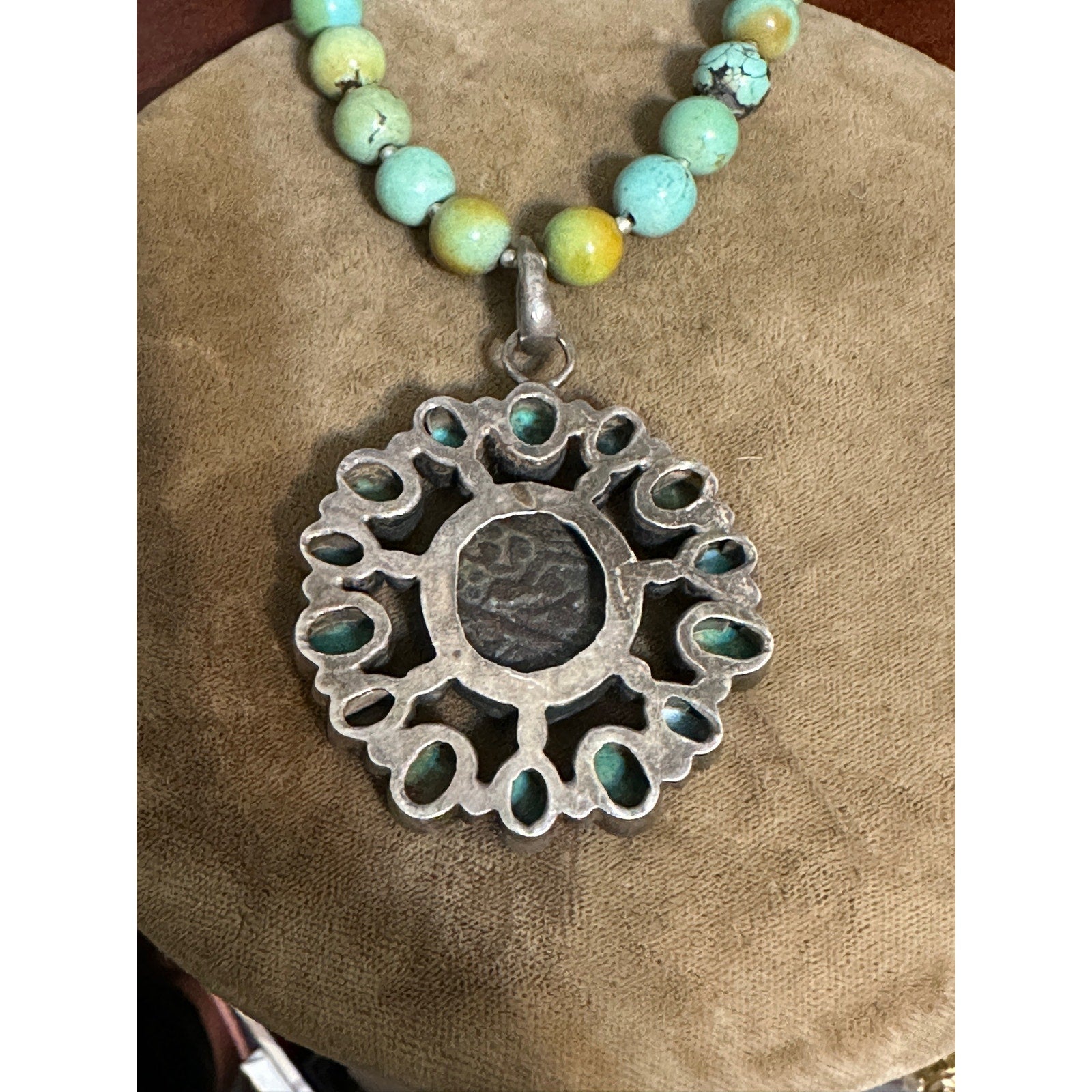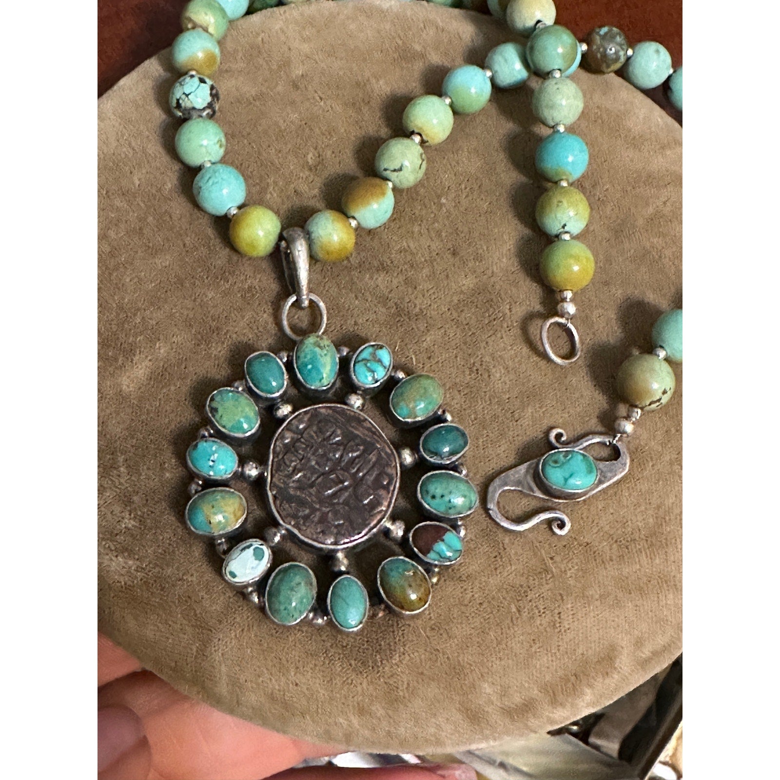 Amazing 8mm Beaded Turquoise Necklace with Silver Turquoise Ancient Coin Pendant , Unsigned 16 1/4” long. Pendant is 2” x 1 5/8”.