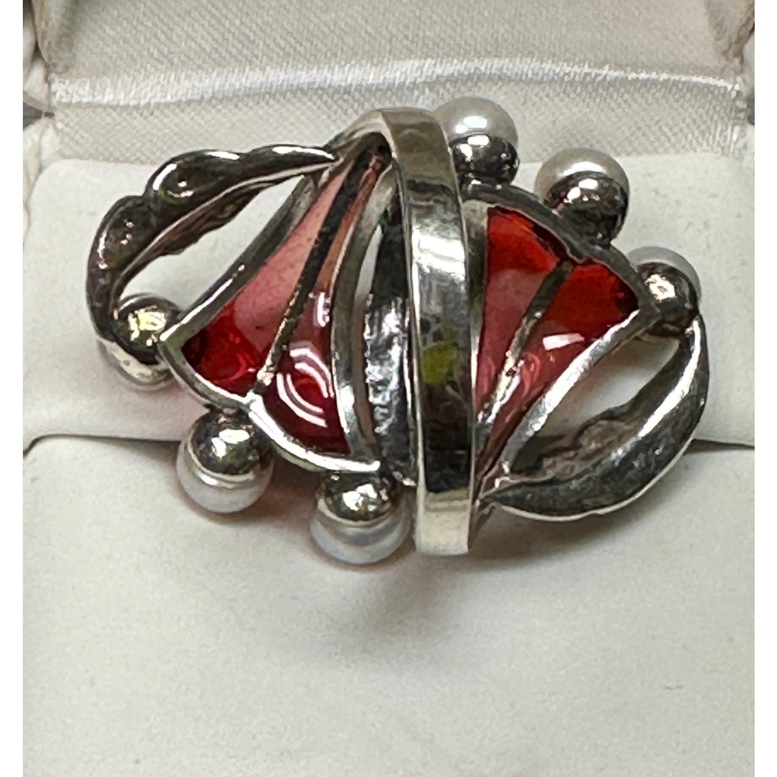 Beautiful Modern Art Nouveau Inspired Floral Design Colourful Plique A Jour ( poured glass) Cultured Pearl Sterling Silver Ring size 9. Measures 1 1/4” wide. Pearls are approx 5mm. Perfect holiday ring. Very Christmasy