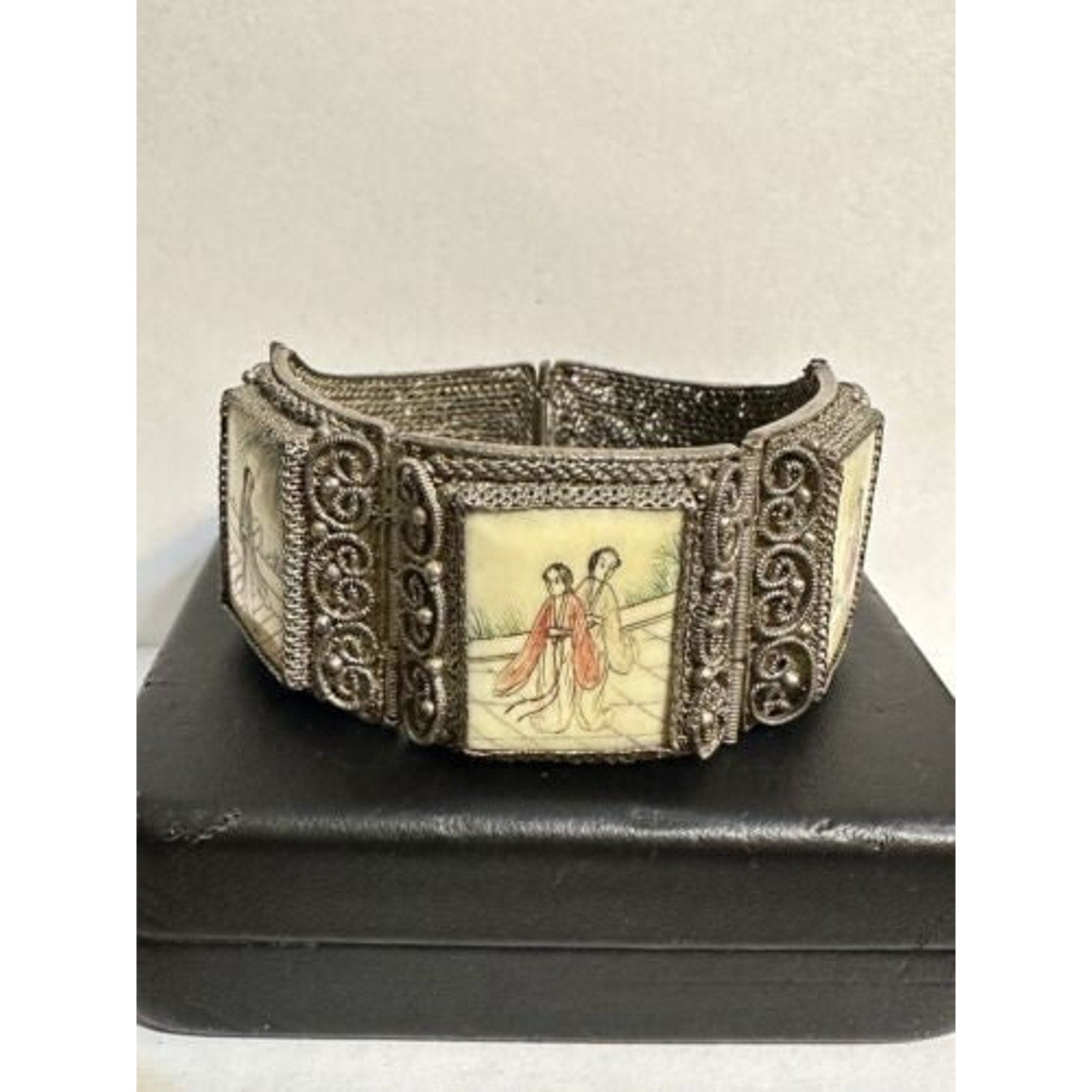 Chinese Silverplated Filigree Painted Panel Bracelet