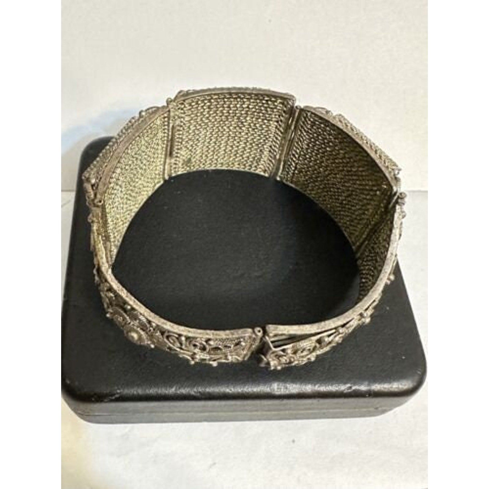 This Chinese bracelet is a stunning piece of jewelry that is sure to catch the eye of any collector. Made from silverplated filigree, it features a beautifully painted panels that showcases the intricate craftsmanship of Chinese artisans. Whether you are a seasoned collector or just starting out, this Chinese Silverplated Filigree Painted Panel Bracelet is a piece you do not want to miss out on.
