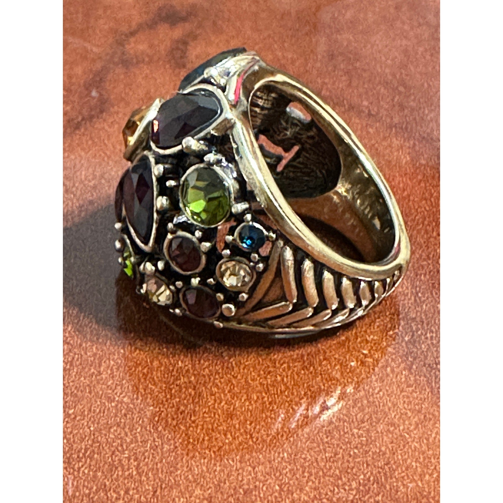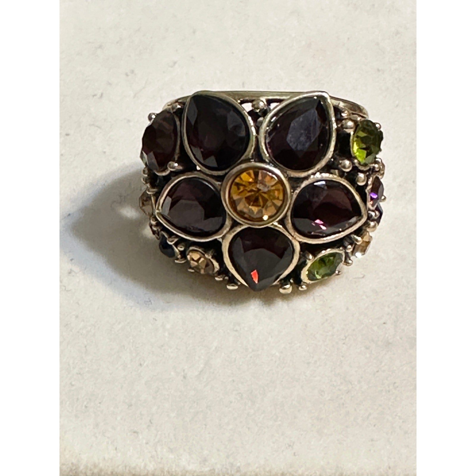 Heidi Daus Gold-tone Wide Fantasy in Floral Jeweled Flower Ring Size 7. Stunning Flower in purple amethyst crystal and citrine crystal center stone. Excellent condition. No wear to the band. All stones are lovely.