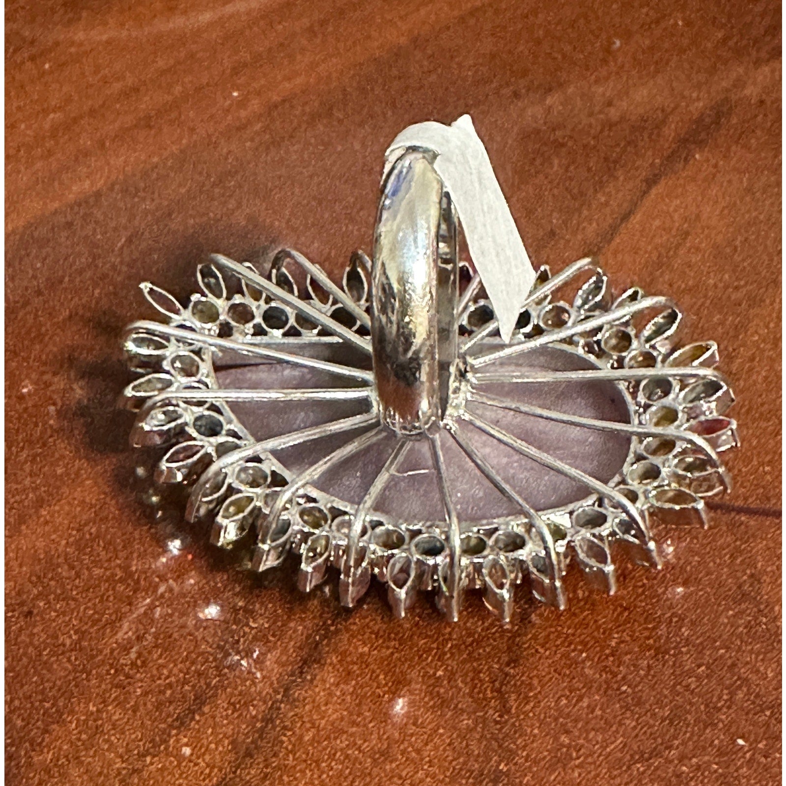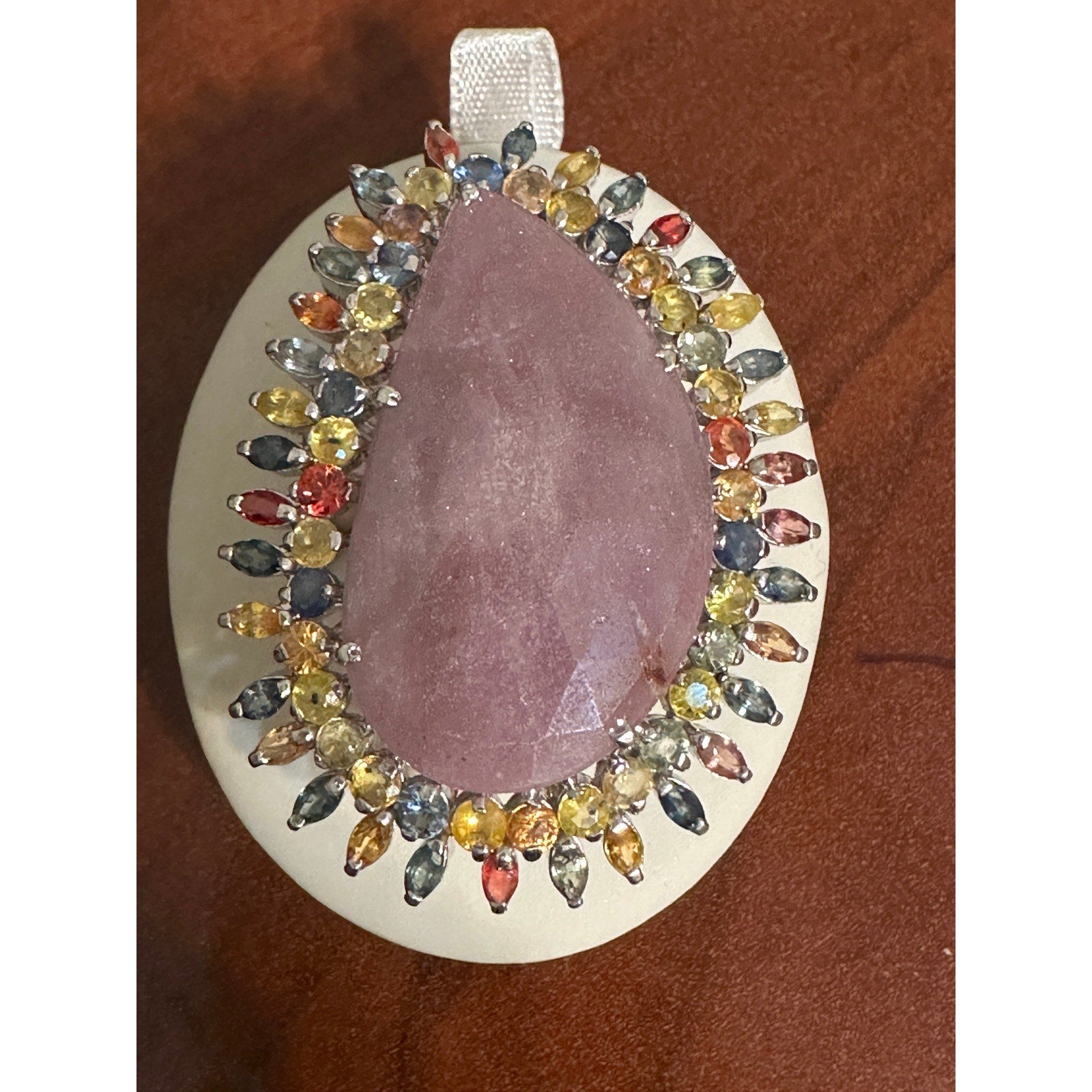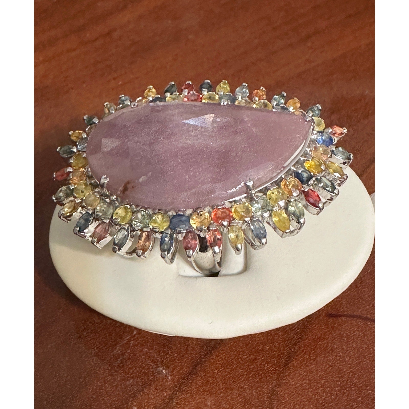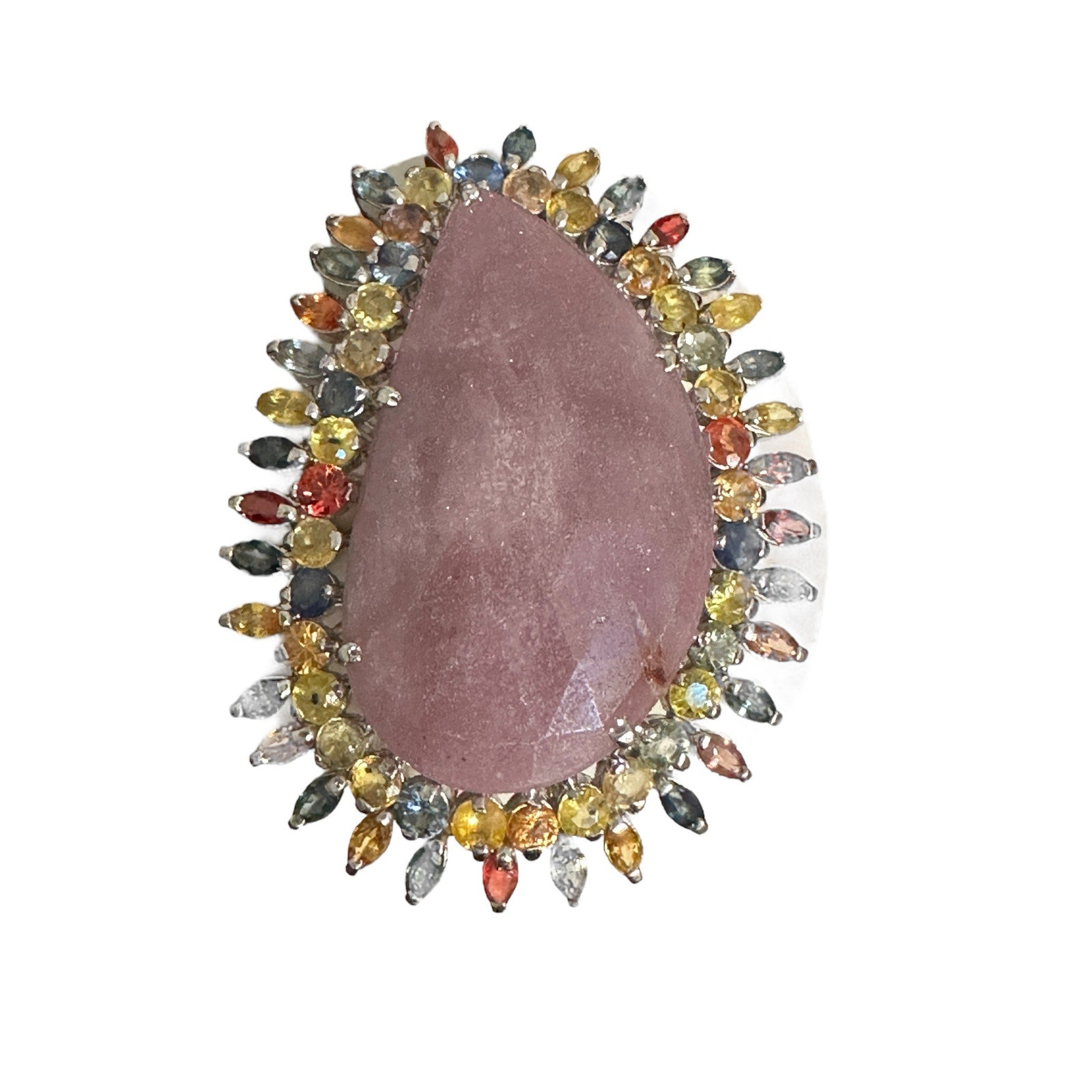 This piece features a large, faceted gemstone with a pear-like shape surrounded by various colored stones. The central stone has a soft, pinkish-purple hue with internal inclusions and a somewhat opaque look, which could suggest it is a type of quartz, possibly rose quartz or lavender quartz. The surrounding stones in a variety of colors, multicolor gemstones.