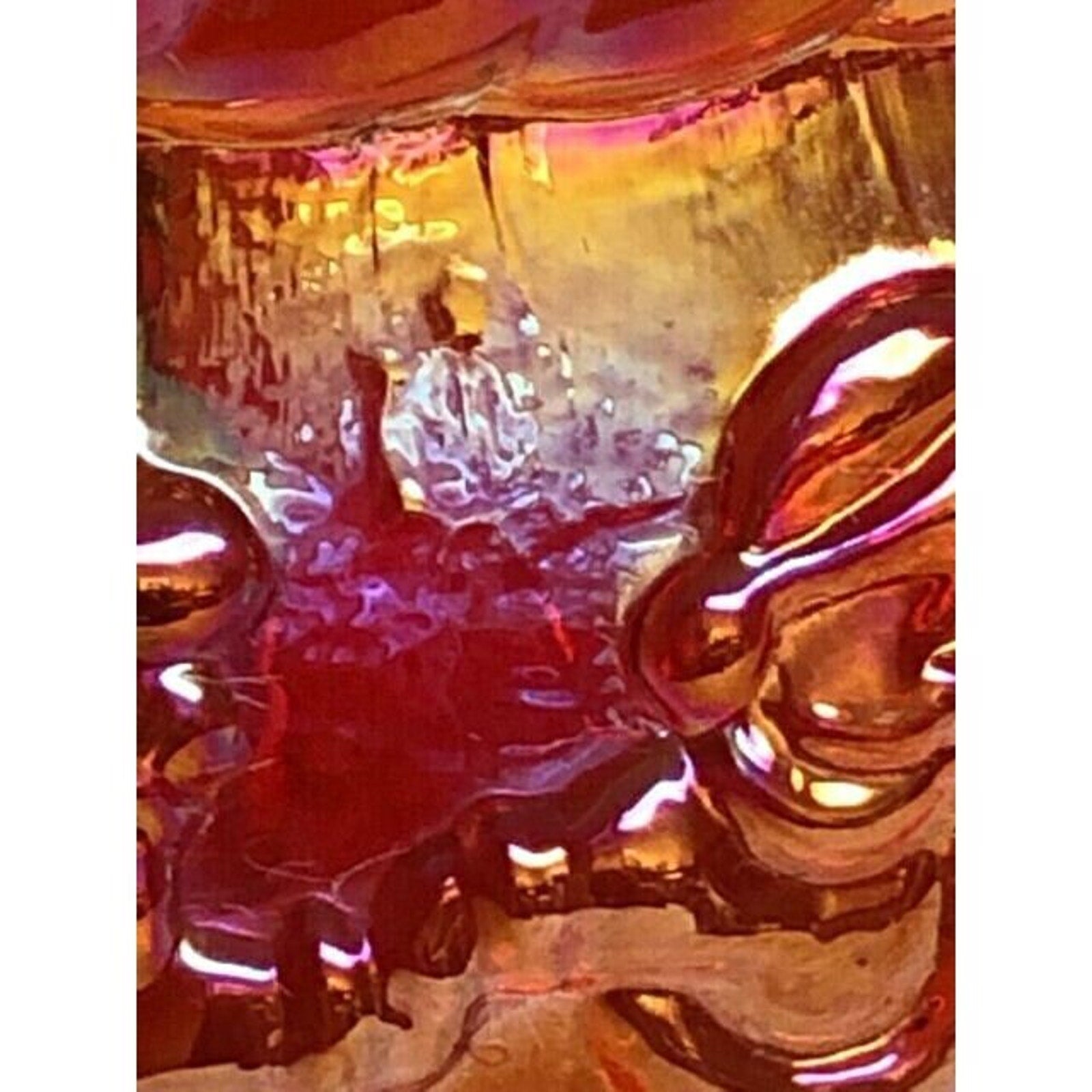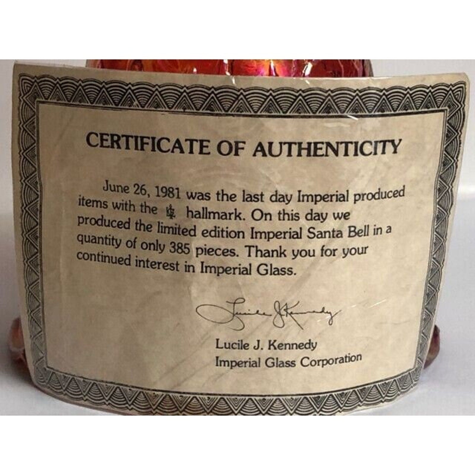Imperial Sunset Ruby Carnival Glass Santa Bell. On the last day that Lenox Imperial was in business (June 26, 1981), the very last item they produced with the LIG hallmark was 385 pieces of this bell.3 panel design with pine trees all around:8 point Star of Bethlehem in the sky, Church with pathway leading to front steps, Waving Santa in a 2 horse pulled sleigh. Lower rim is encircled with walking Santas holding hands. A poorly marked LIG trademark can be somewhat seen. I tried to capture in the pictures and is located just below the roped border in bewteen 2 santas .Very poor mark but guaranteed authentic! No chips, no dings, no cracks. Comes with the original Certificate of Authenticity.