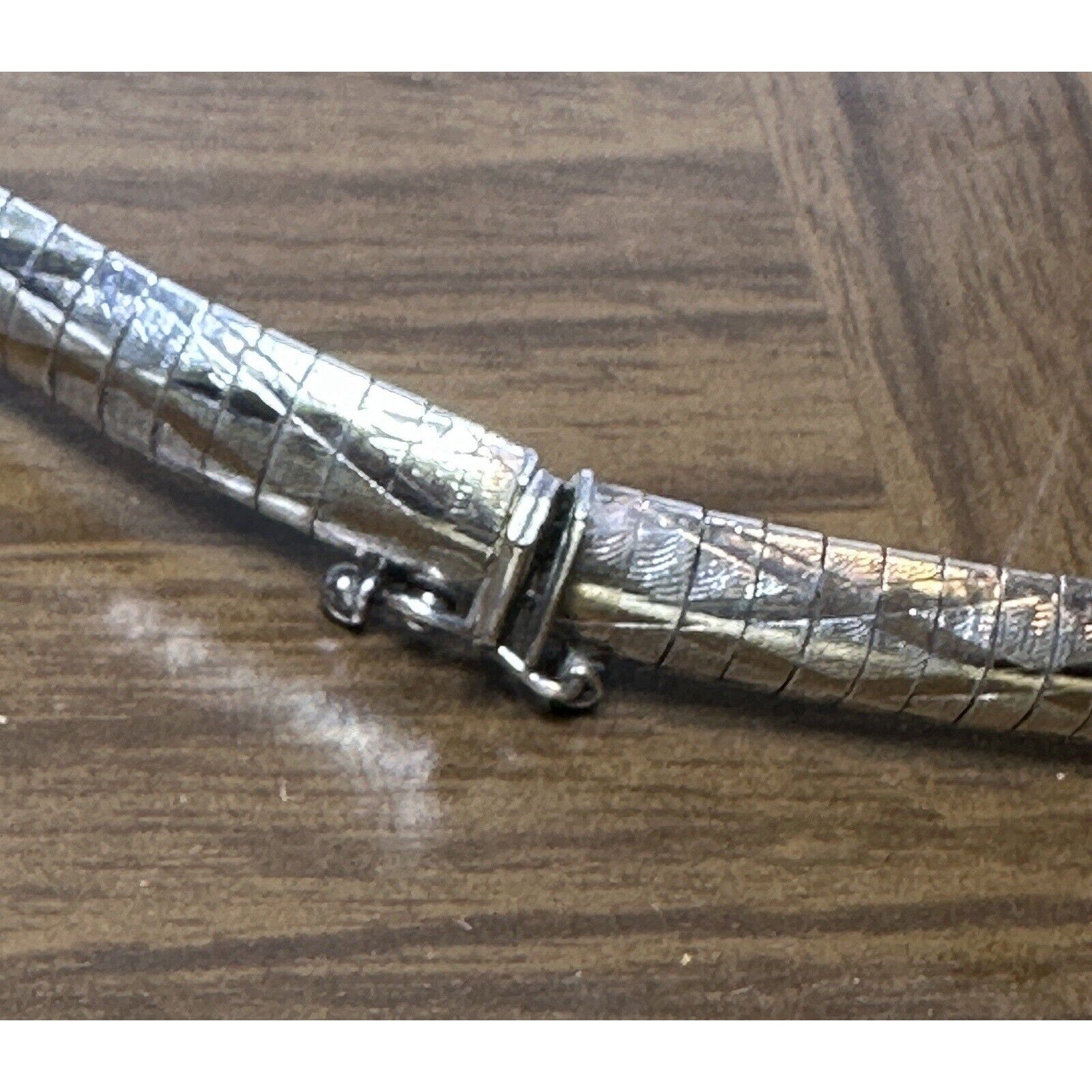 This beautiful collar style necklace is a testament to the craftsmanship of Italian jewelers. Made of high-quality 925 sterling silver, this piece is both elegant and durable. The intricate etched design adds a touch of sophistication, while the push lock closure with safety catch ensures a secure fit.