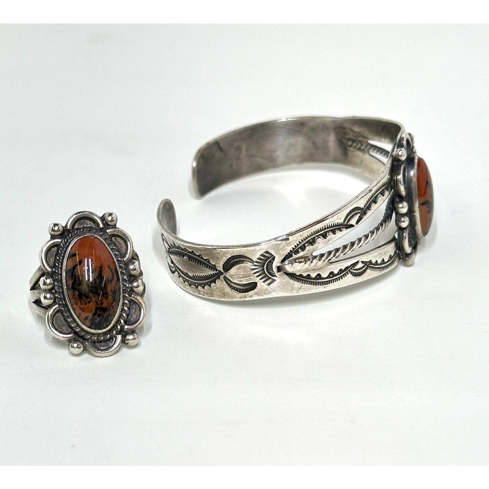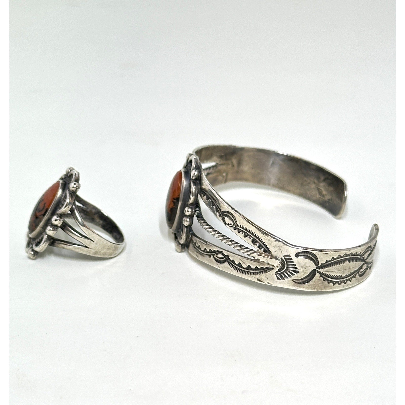 Native American Sterling Silver Red Jasper Petrified Wood Cuff Bracelet & Size 6 Ring