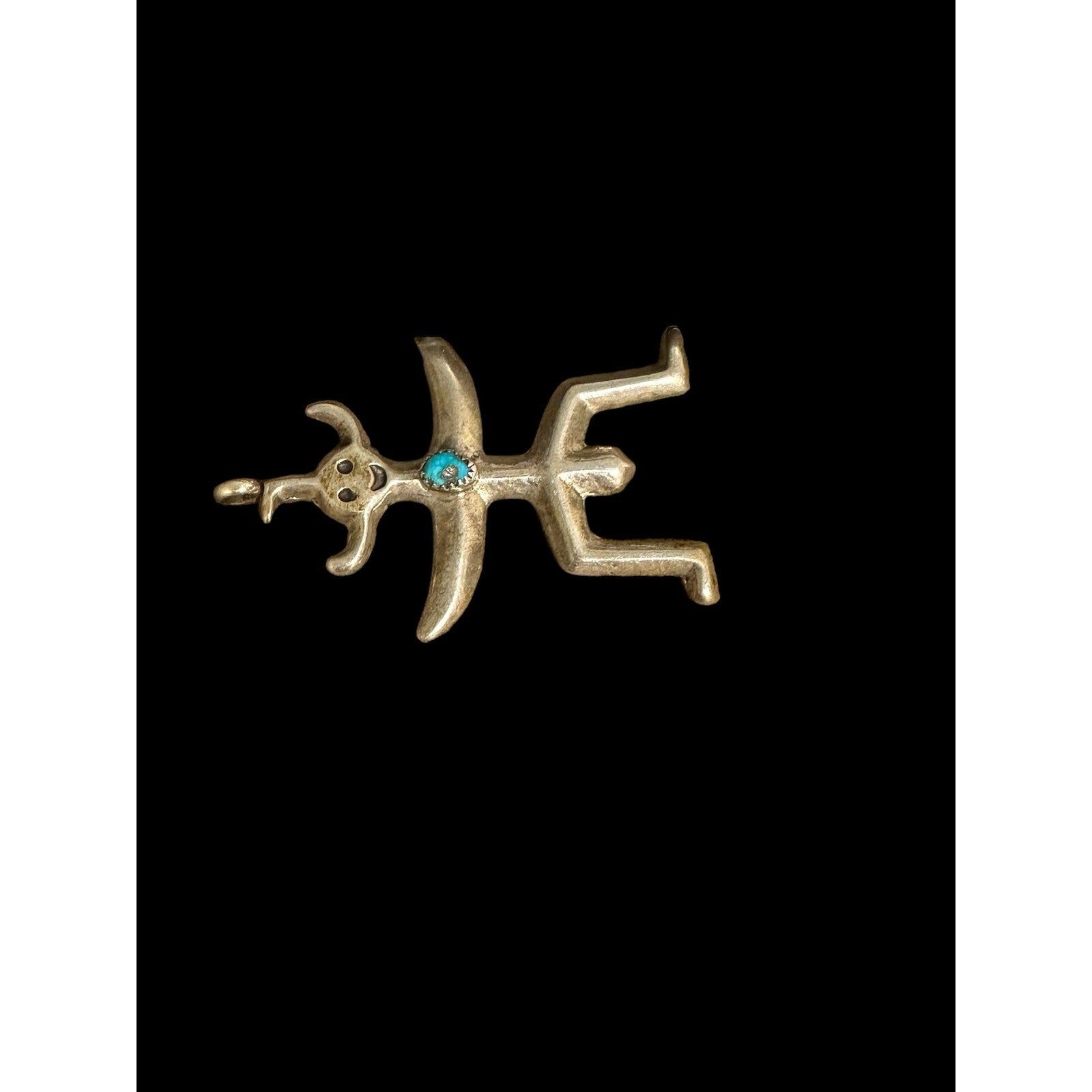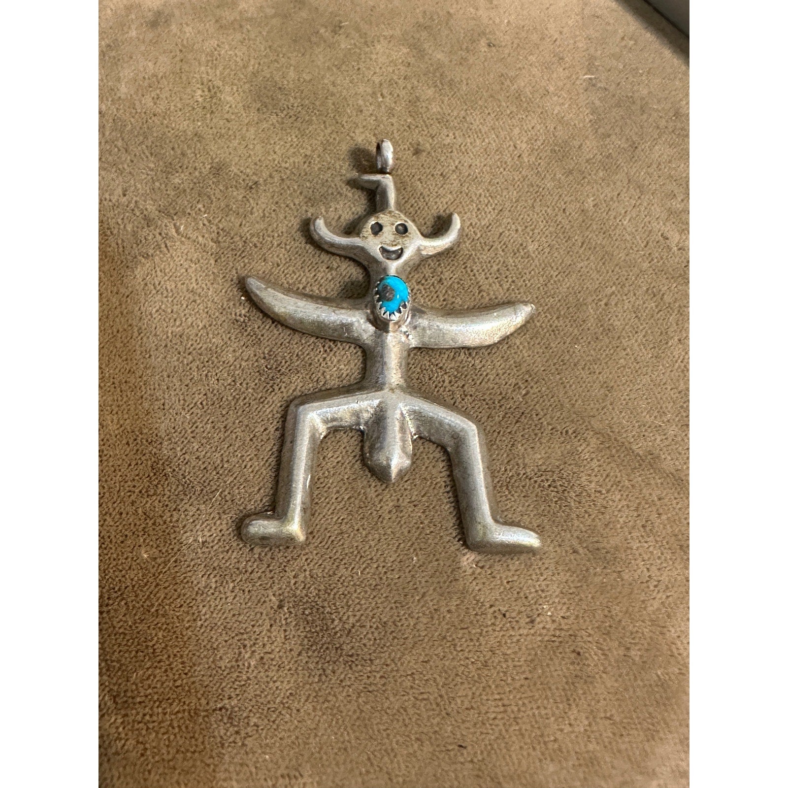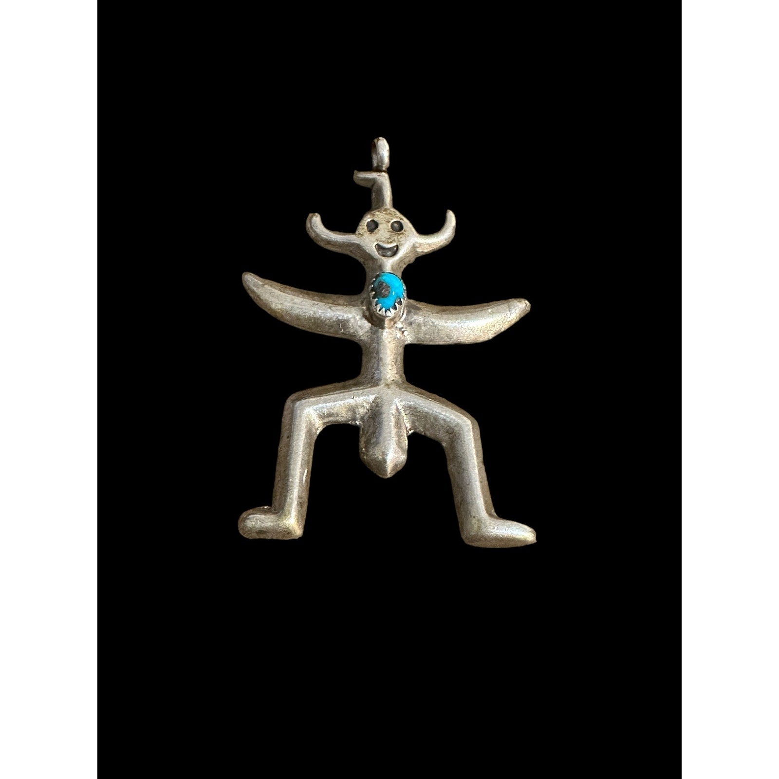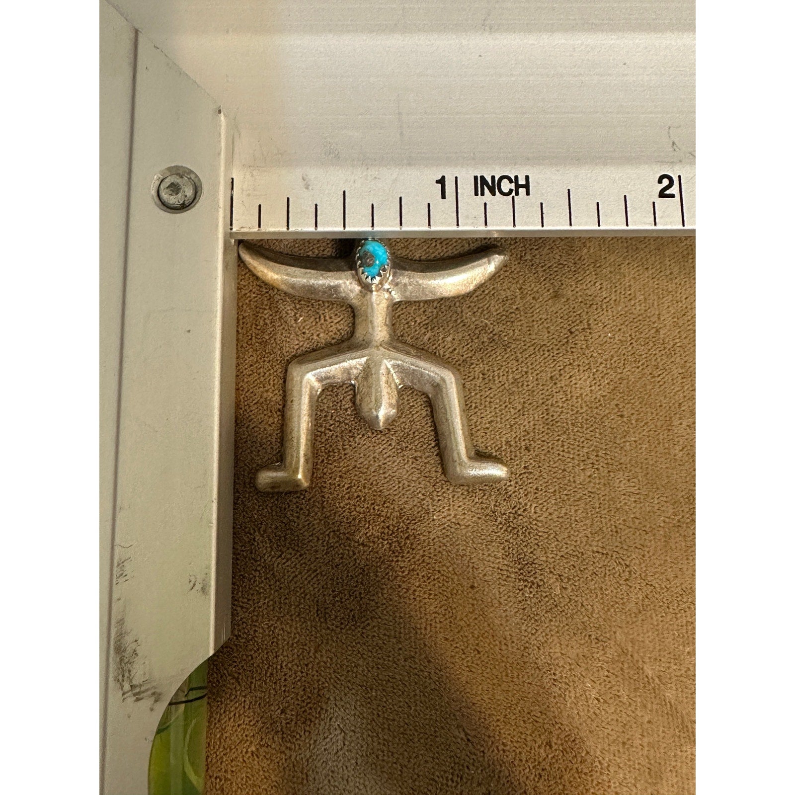 Navajo Native American Sterling Silver Turquoise Horned Kachina Figure Pendant. 2” x 1 1/4”. 8 grams
