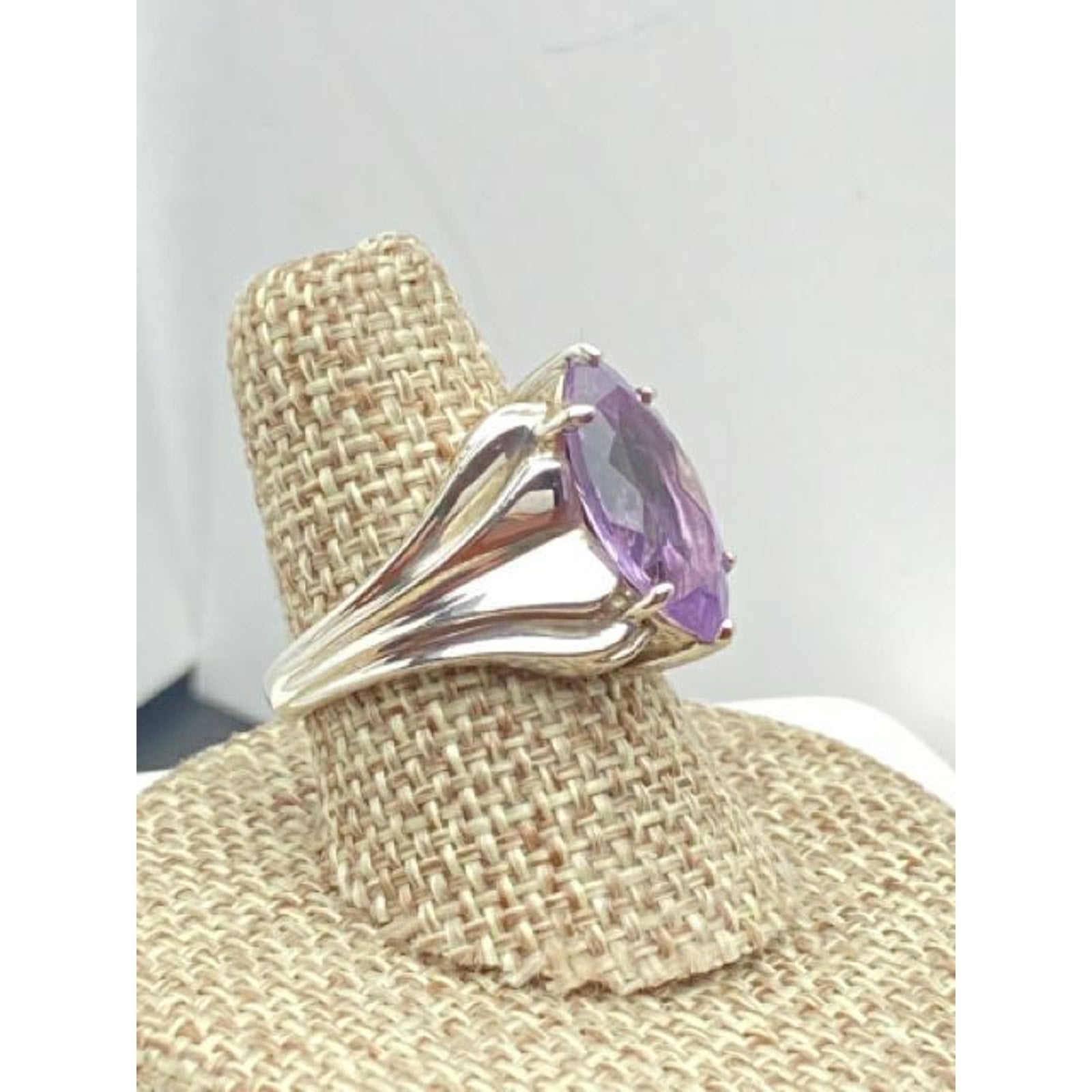 Sterling Silver Marquise Amethyst Ring Size 7. 7mm x 8mm. Has an Art Nouveau flare to the mounting. Just stunning!