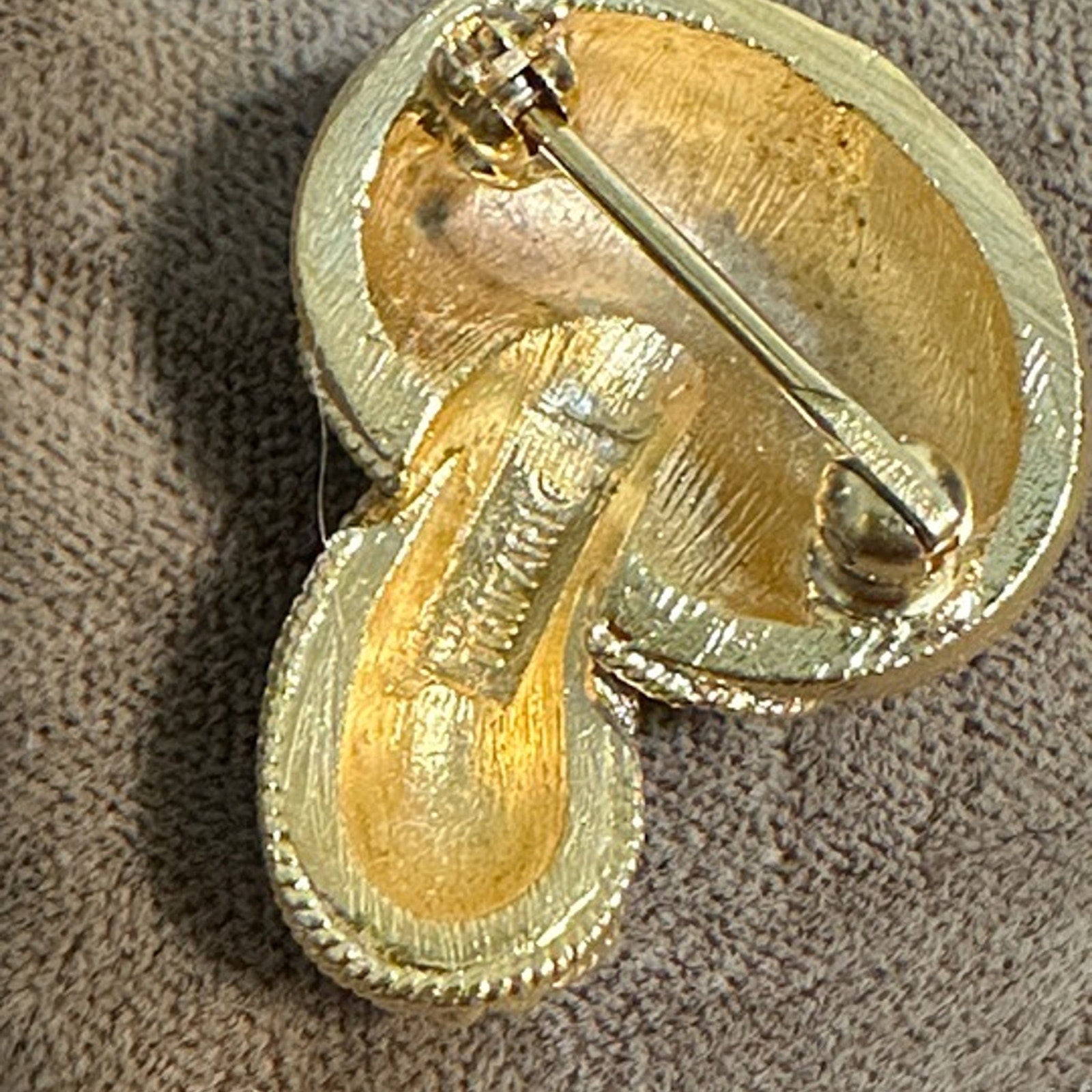 Enhance your collection with this charming Vintage Crown Trifari Brushed Goldtone Petite Mushroom Pin. Perfect for vintage enthusiasts and Trifari collectors, this elegant pin boasts a timeless design with its brushed gold-tone finishing, capturing the classic allure of Trifari jewelry. Its petite size makes it a subtle yet stylish accessory that can adorn any outfit without overpowering it. Measures 7/8” x 5/8”.
