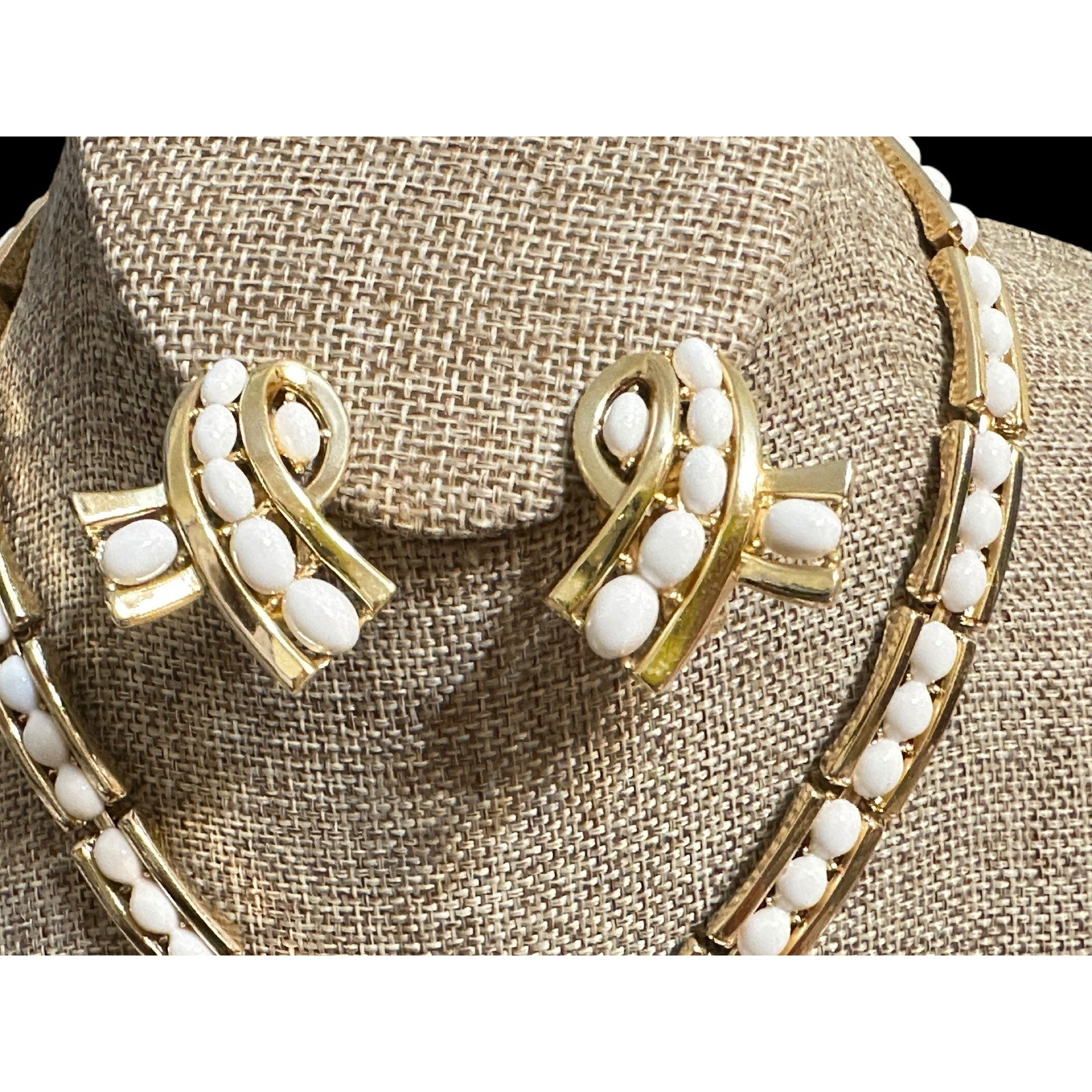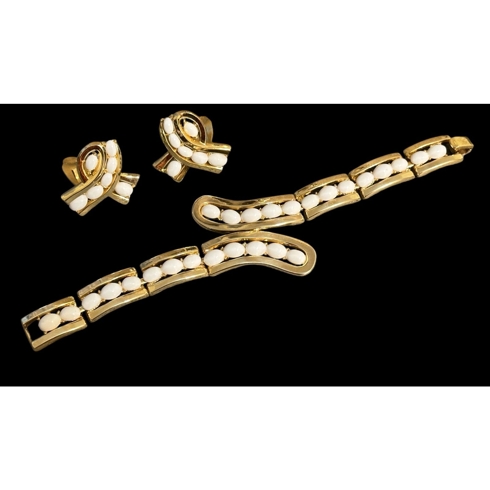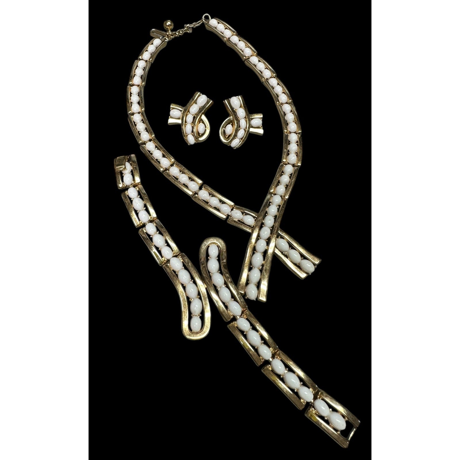 Vintage Crown Trifari Gold White Marquise cabochon Necklace Bracelet Earrings SET