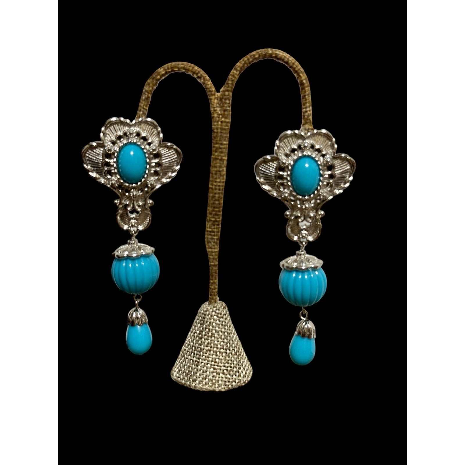 Vintage Huge Barrera for Avon Silver-tone Faux Turquoise Dangle Clip Earrings. They measure 3 1/2” x 1 1/4”. Excellent condition