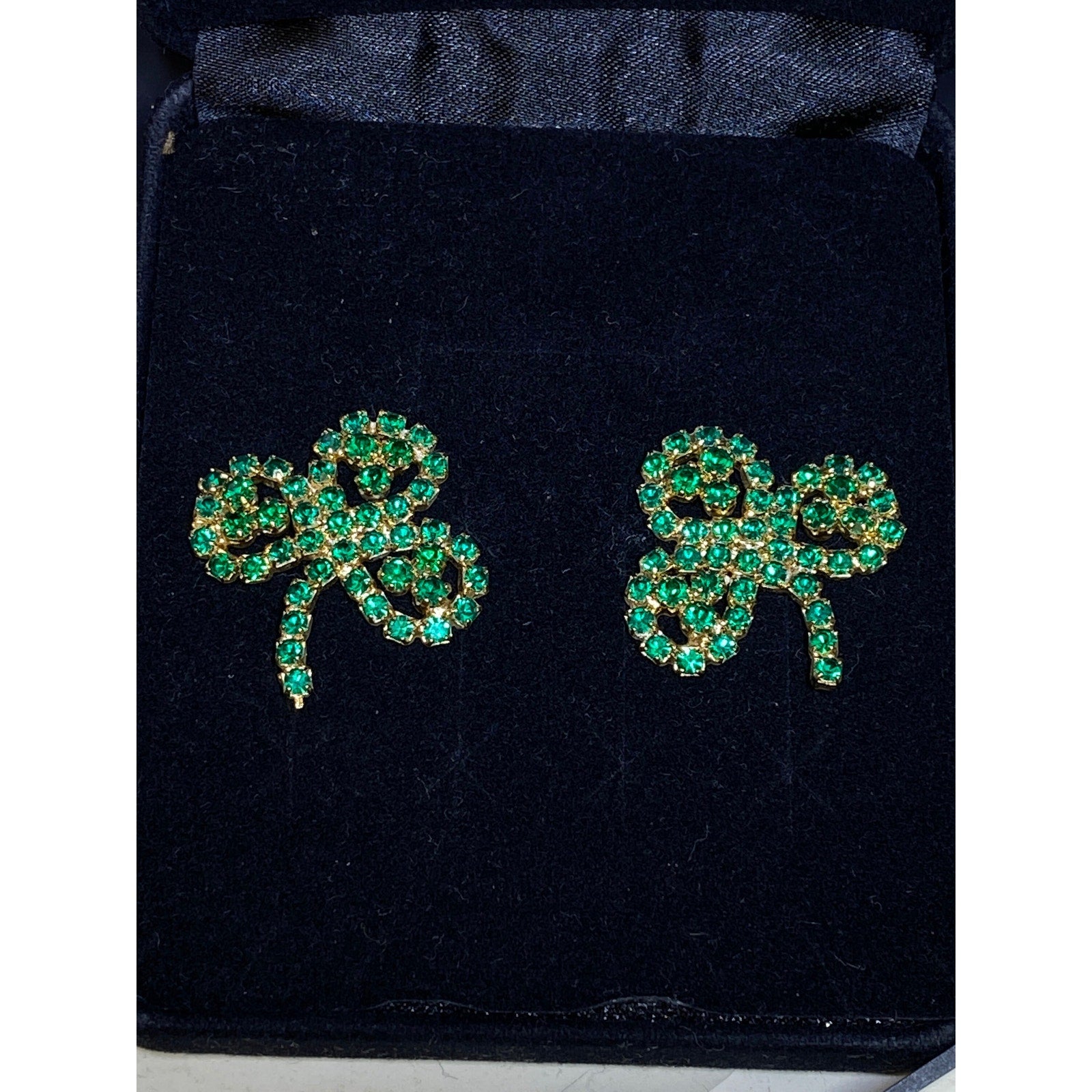 Vintage Large Goldtone Green Rhinestone SHAMROCK Pierced Earrings. 1 1/8". Excellent Condtion. Hand Set, Prong Set Emerald Green Rhinestones. Like New Condition. Perfect for Saint Patrick's Day!