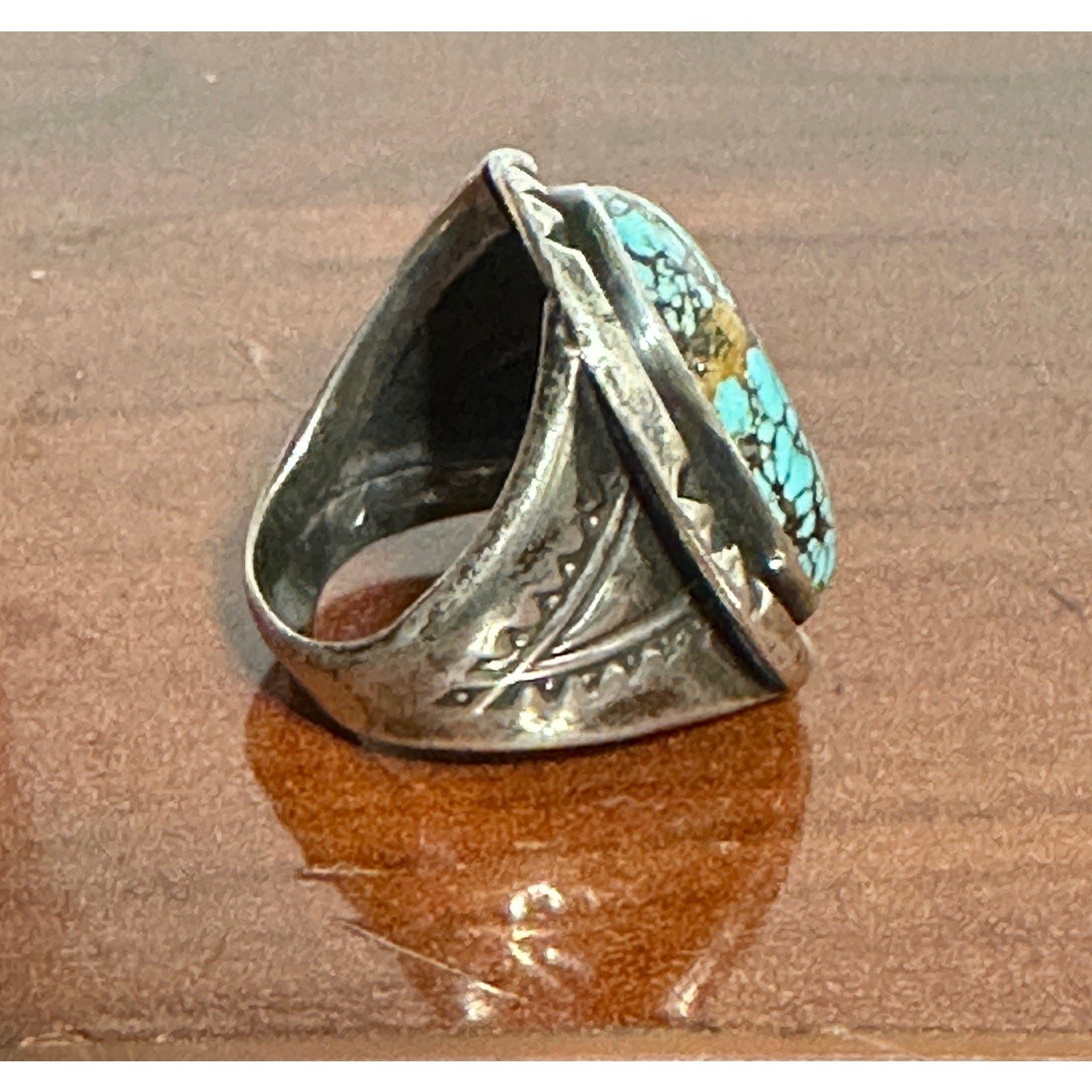 Vintage Unsigned Large Sterling Silver Turquoise Native American Stamped Ring Size 8.75. Measures an 8 but fits me, an 8.75. Top is approx 1" x 7/8". Stone is beautiful, has a rough spot on the side where the brown section is. Shown in the side shot photo. I assume this is natural to the stone but use your own judgment.