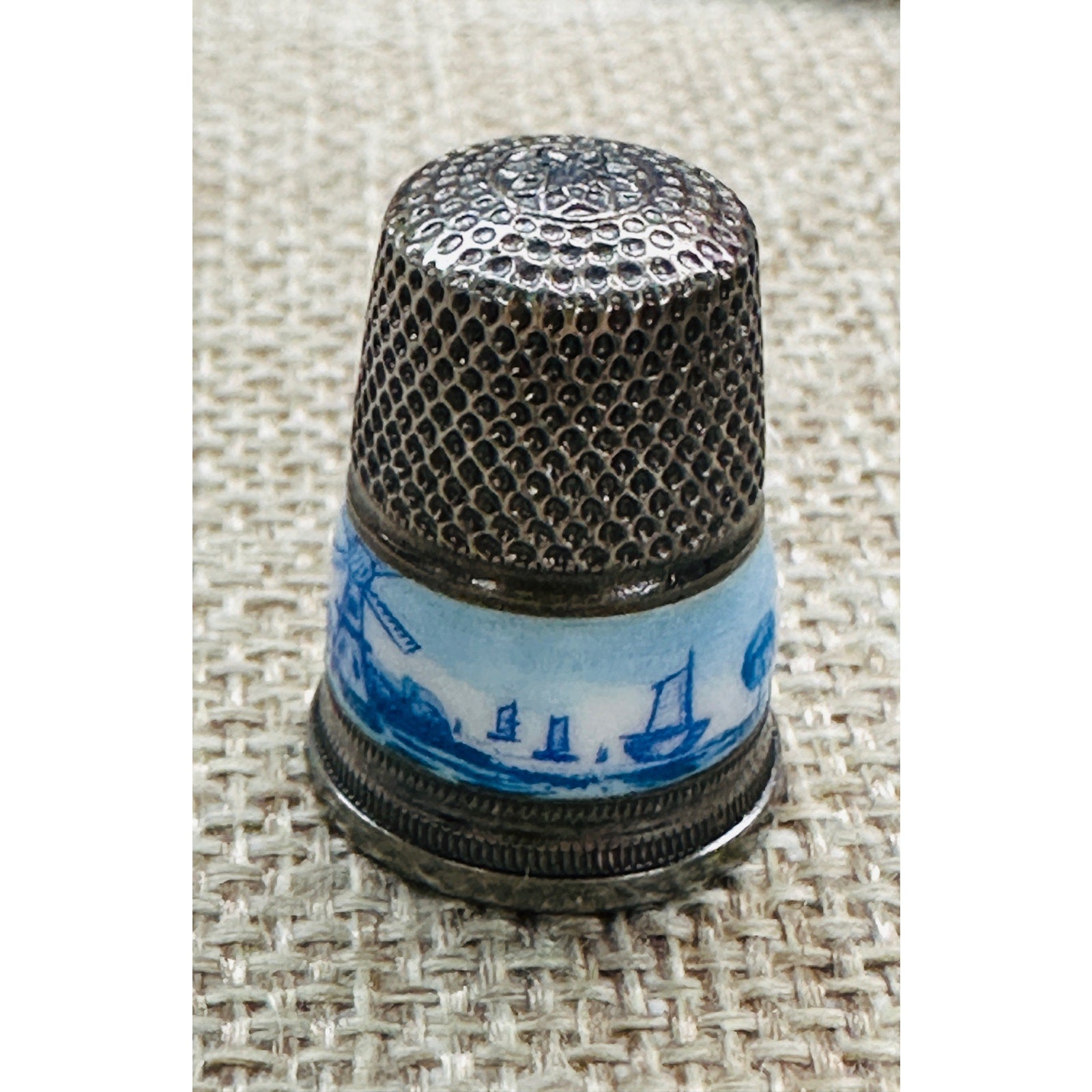 Vintage Sterling 935 Silver DUTCH DELFT ENAMEL THIMBLE - Windmill Landscape