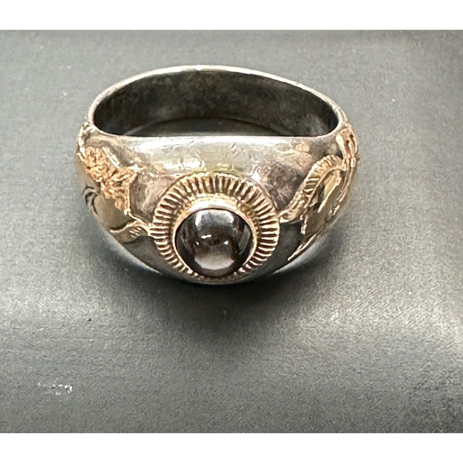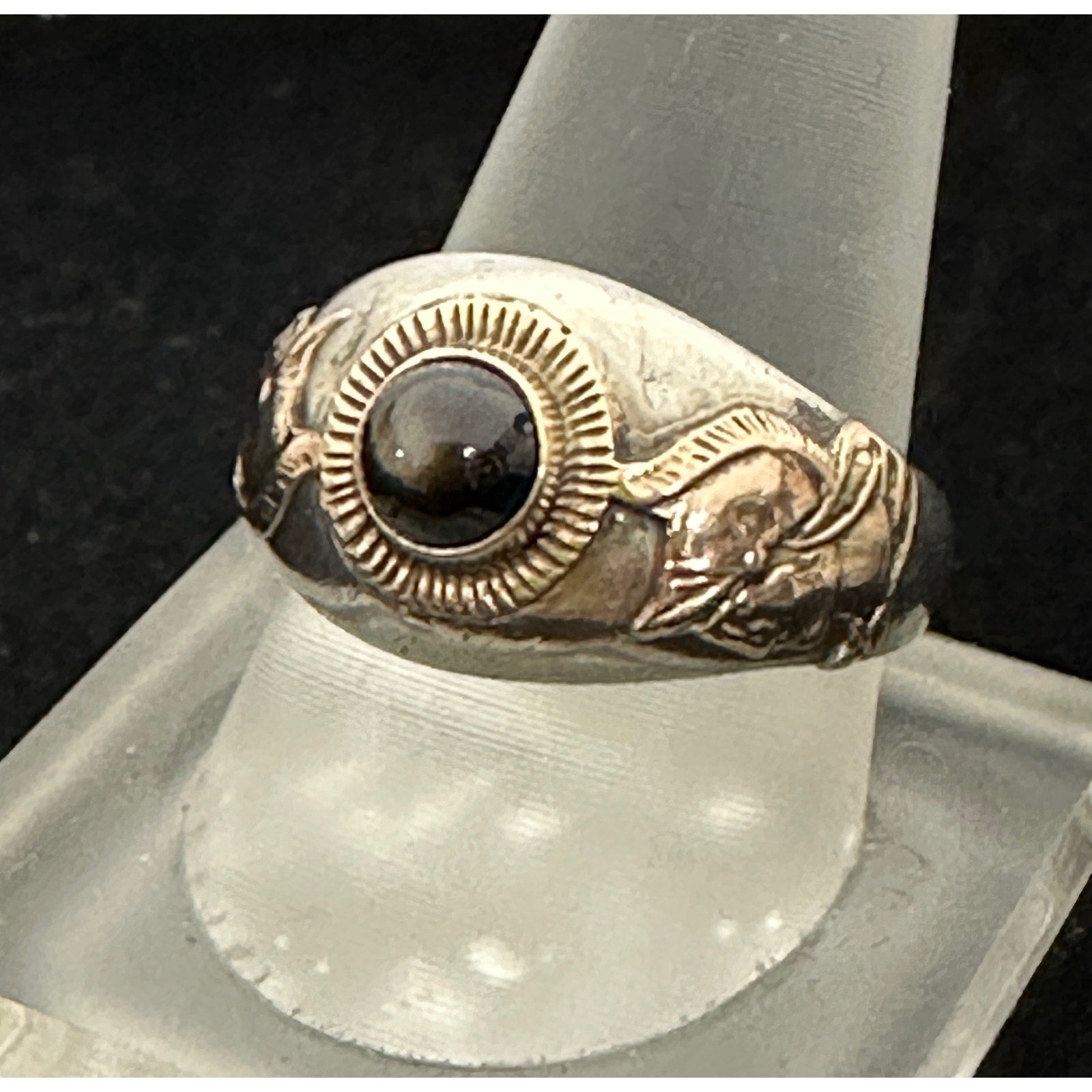 Vintage Sterling Silver 14k Gold Trojan Ring Size 9. Marked WG 14K. Has some wear but this ring is fabulous! The stone has a shimmer in the center. Not sure what it is. Dark color with a gray shimmer. Like a cat eye but not a line line a cat eye.