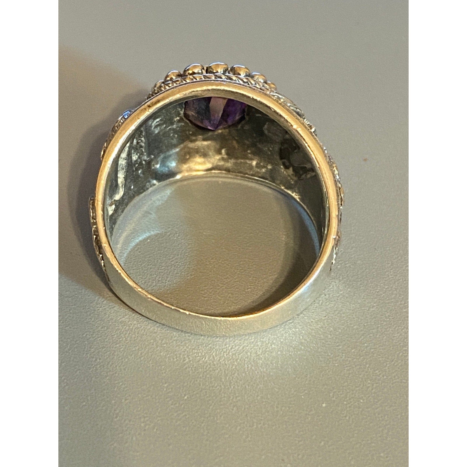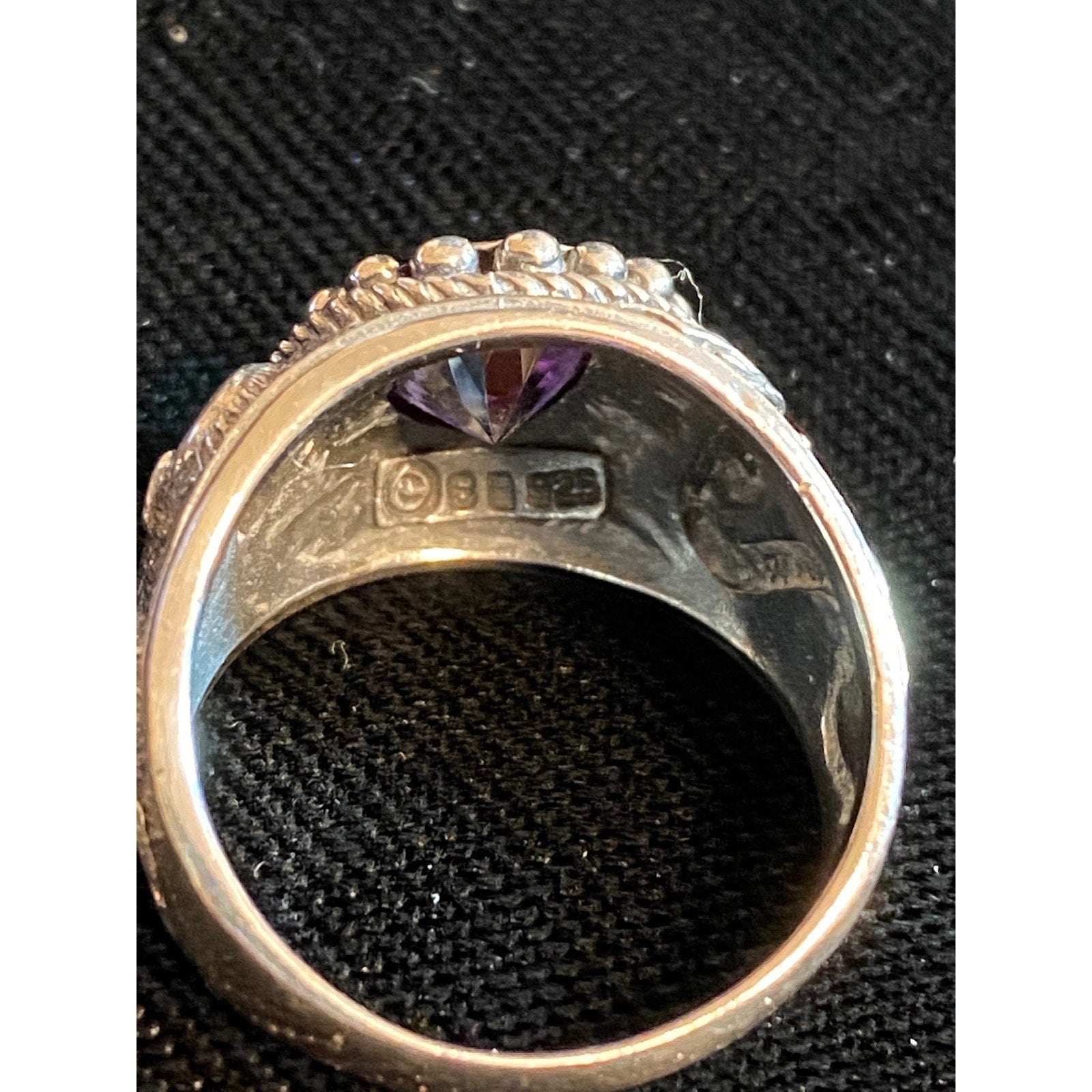 I love this ring. The stone is lovely with deep purple color but flashes of Ruby red and violet. Honestly not sure if this is Amethyst or some other gemstone as it is the prettiest amethyst I have ever seen if it is. It is a size 8 3/4" x 5/8" wide. The stone is approx 9mm x 7 mm. Weighs 7.8g.