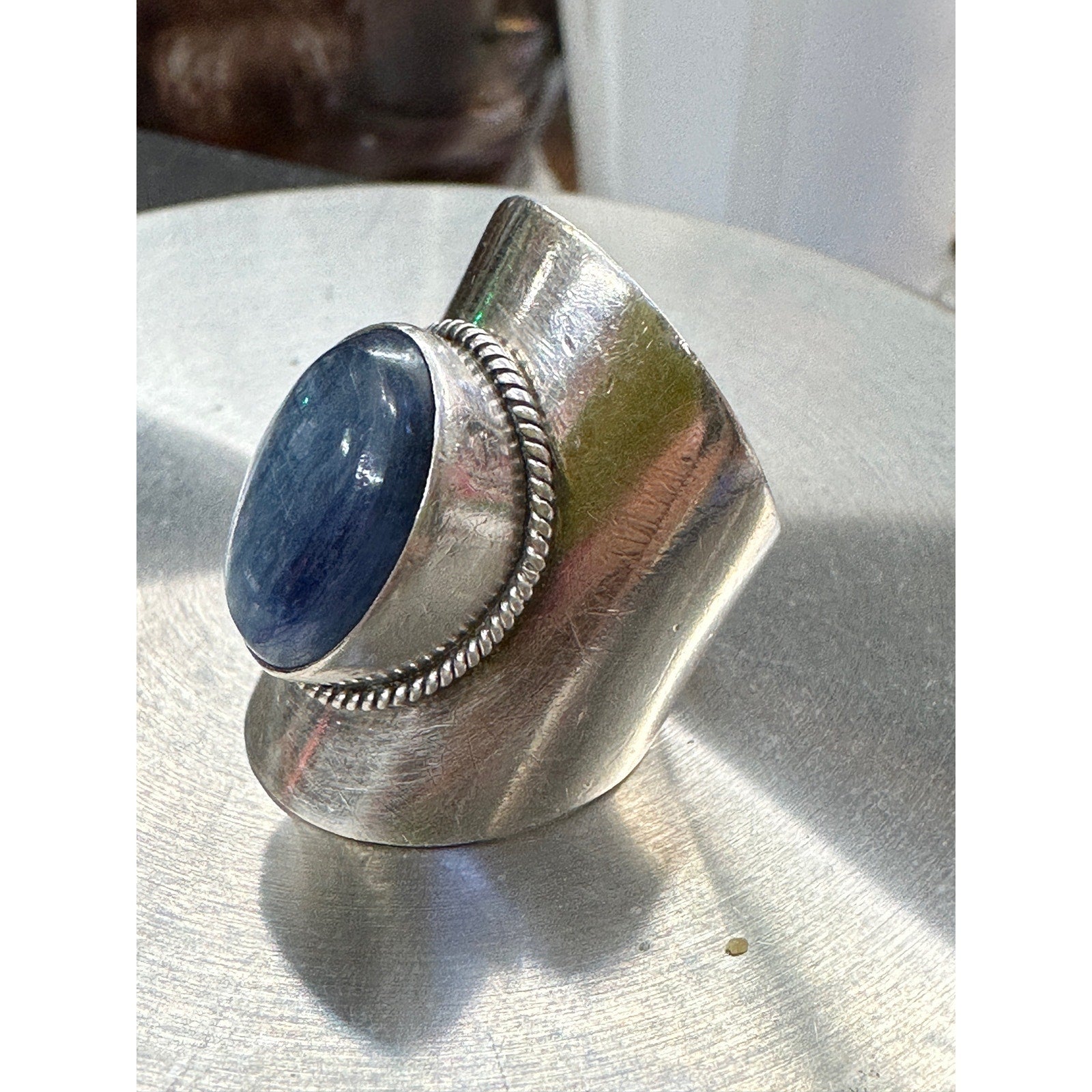 Vintage Sterling Silver Wide Band Blue Kyanite Ring Size 8. Fabulous design and stunning shimmering blue kyanite oval stone and wide band. It measures 1 1/4” wide. Stone is 3/4” x 1/2”.