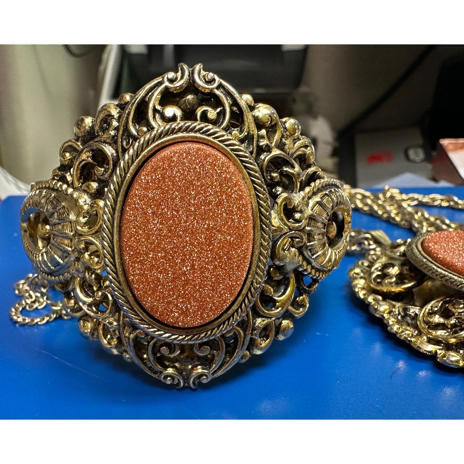Vintage Victorian Style Goldtone Goldstone Necklace & Hinged Bangle. Bracelet measures 6 3/4” x 1 7/8”. Necklace is 22”. The pendant is 2” x 1 5/8”. Great condition.