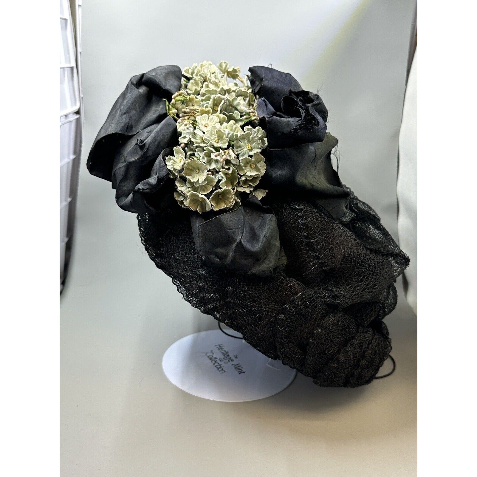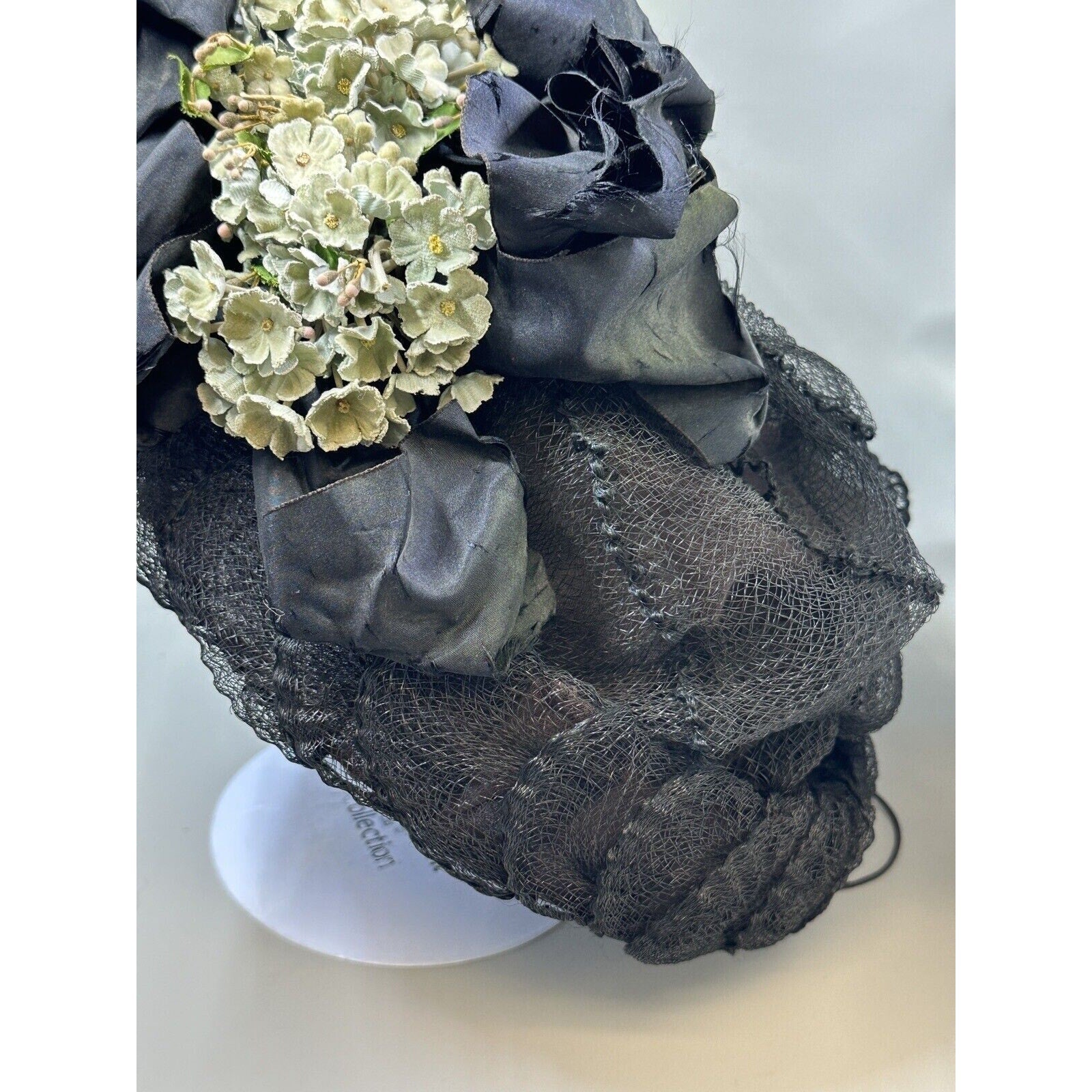 Vintage Victorian Wire Framed Black Net Ribbon & Velvet Flowers Hat