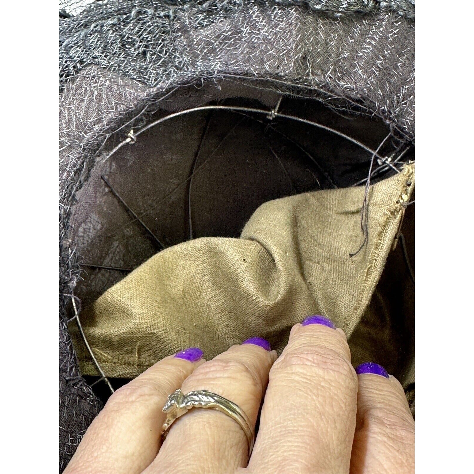 Original Vintage Victorian Ladies hat. The frame is wire with wrapped thick netting , Black Ribbon and Flowers. The lining looks replaced and needs restitched. Some tattering to ribbon but overall amazing condition for age. Measures 6" across the inside.