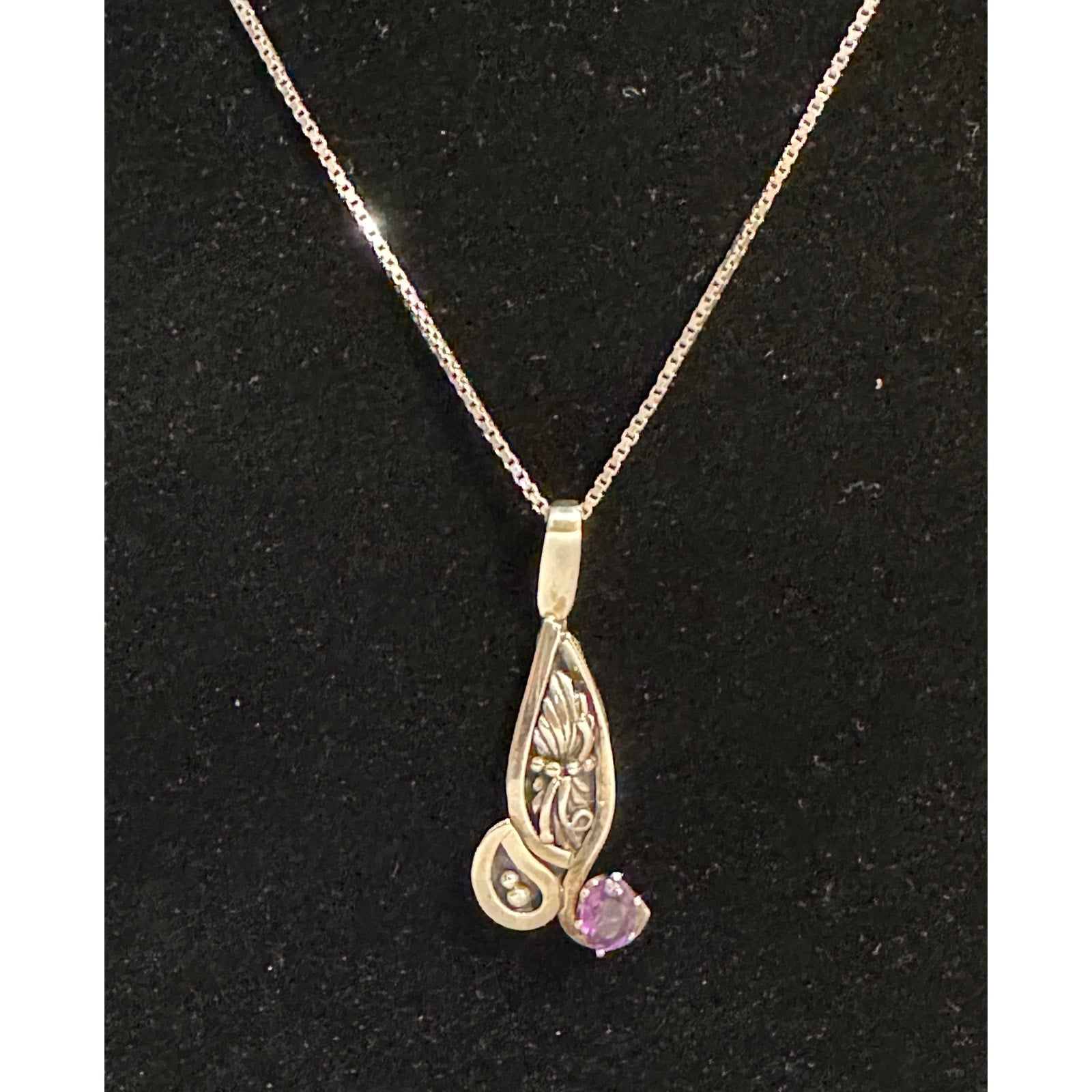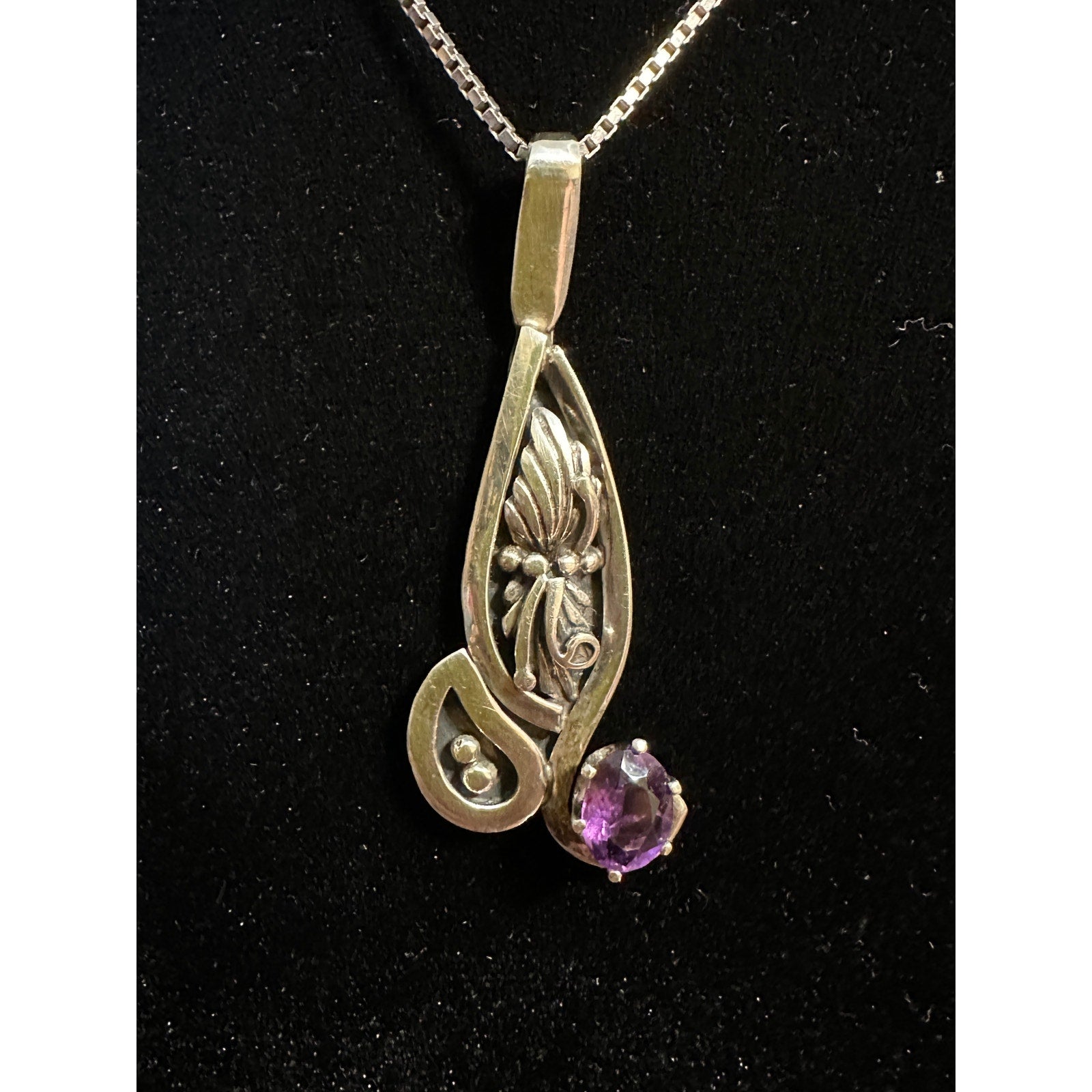 Vintage W. Begay Sterling Silver Amethyst Pendant Necklace. Chain is 18” , the pendant is 2” x 3/4”. Total weight is 10.2g. Partially Signed as shown. The amethyst is 7mm x 5mm. Has an internal feather or occlusion.